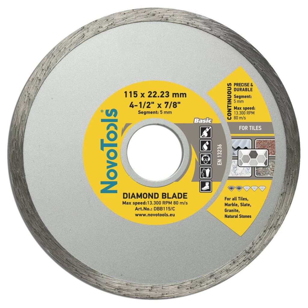 قرص ماسي NovoTools Basic 115 × 22.23 مم، للبلاط - أقراص قطع ماسية احترافية 115 مم × 5 مم × 22.23 مم. سلسلة قياسية - حل اقتصادي للأعمال المنزلية. قطع قطاعية، بلاط، توربو. من 115 إلى 350 مم. قطع آمن وعالي الجودة. حبيبات الماس الكاشطة توفر أداءً عاليًا وتآكلًا منتظمًا. سرعة مسموح بها تصل إلى 13300 دورة في الدقيقة - عمل آمن على جلاخات الزاوية القياسية. يفي بمعيار السلامة EN13236.