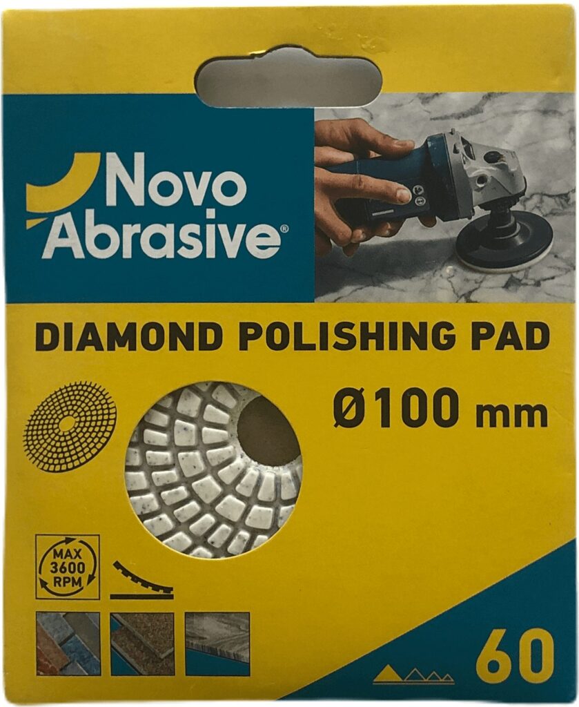 Диск алмазний полірувальний NovoAbrasive 100 мм, Р60 підходить для обробки: Бетон, Камінь, Граніт, Мармур, Кераміка / Плитка, Скло. Обирайте відповідний режим роботи залежно від твердості матеріалу.