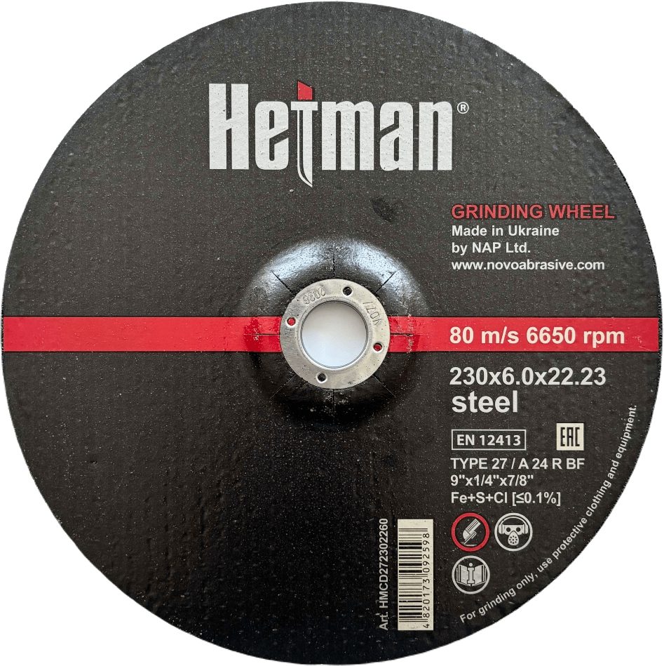 قرص تجليخ هيتمان 27، أبعاده 230×6.0×22.23 مم، مناسب للمعادن، ويُستخدم لمعالجة: فولاذ مقاوم للصدأ، والفولاذ، والحديد الزهر، والألومنيوم، والمعادن غير الحديدية. اختر وضع التشغيل المناسب حسب صلابة المادة.