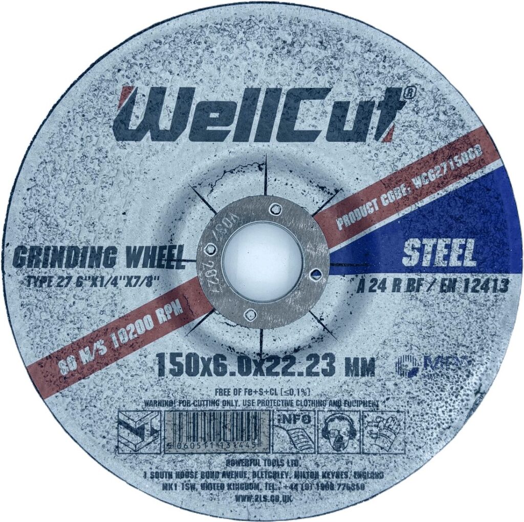 تتوافق عجلة التجليخ WellCut 27 مقاس 150x6.0x22.23 مم، والمخصصة للمعادن، مع معيار السلامة EN12413. ينظم هذا المعيار متطلبات قوة أدوات التجليخ ووضع العلامات عليها واستخدامها الآمن.
