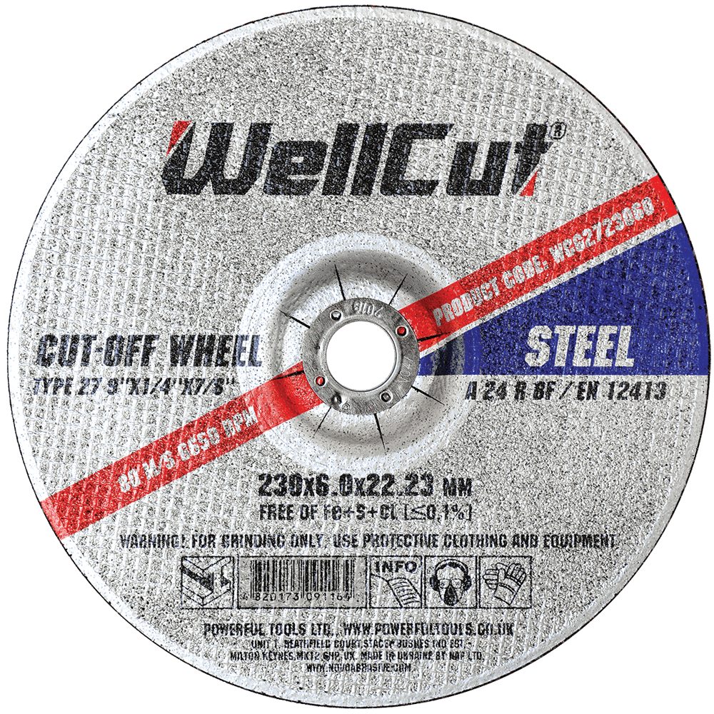 قرص تجليخ WellCut 27، أبعاده 230×6.0×22.23 مم، مناسب للمعادن، ويُستخدم لمعالجة: فولاذ مقاوم للصدأ، والفولاذ، والحديد الزهر، والألومنيوم، والمعادن غير الحديدية. اختر وضع التشغيل المناسب حسب صلابة المادة.