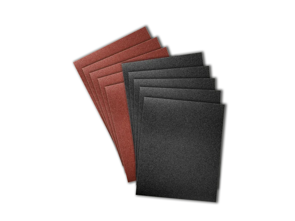 أوراق صنفرة يدوية وأخرى كهربائية. ظهر قماشي للصنفرة الجافة وورق سيليكون مقاوم للماء للصنفرة الرطبة. المقاس: ٢٣٠ × ٢٨٠ مم.