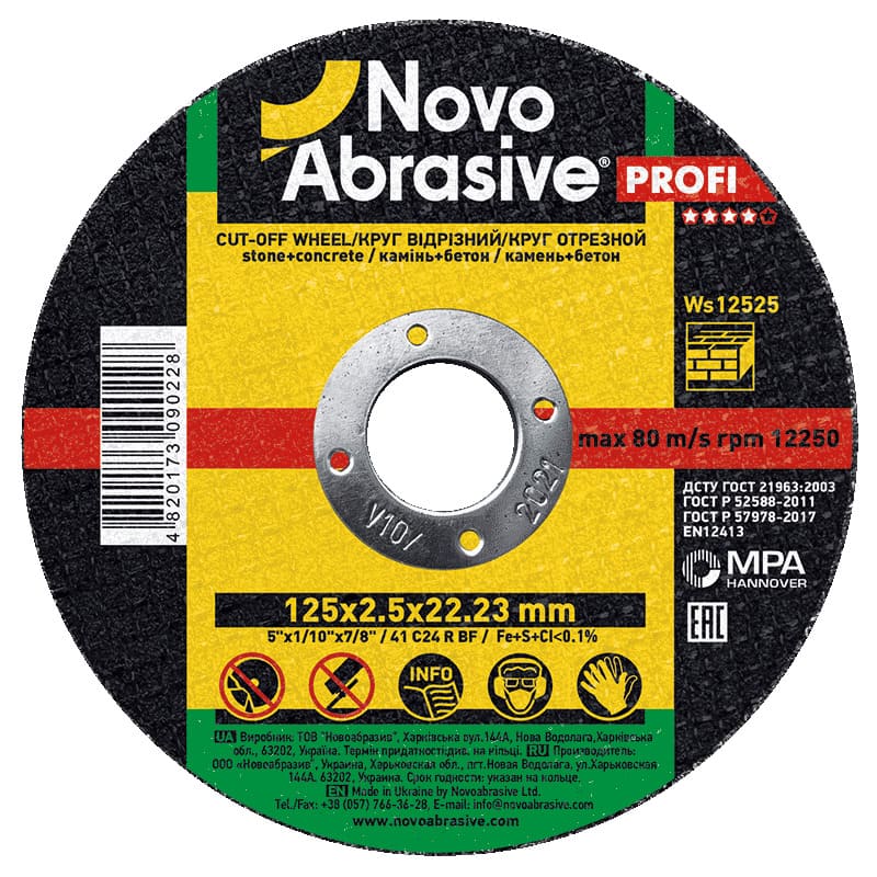 Die Trennscheibe NOVOABRASIVE 41 (125 x 2,5 x 22,23 mm) für Stein entspricht der Sicherheitsnorm EN12413. Diese Norm regelt die Anforderungen an Festigkeit, Kennzeichnung und sichere Verwendung von Schleifwerkzeugen.