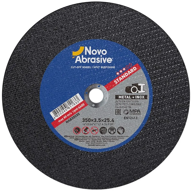 NovoAbrasive Standard 41 Trennscheibe 350 x 3,5 x 25,4 mm, für Metall– professionelle Trennscheiben (350 mm × 3,5 mm × 25,4 mm). Geeignet zum Trennen von Materialien wie Stahl, Edelstahl, Gusseisen und Nichteisenmetallen. Weit verbreitet in der Metallverarbeitung, im Bauwesen, in der Automobilindustrie und in der Rohrherstellung. Die Standard- Serie ist eine zuverlässige Lösung für den privaten Gebrauch und gelegentliche Arbeiten. Erschwinglicher Preis bei gleichbleibender Sicherheit und Qualität. Hergestellt auf Basis von Aluminiumoxid-Schleifmittel (Spezifikation A30 SBF), was eine gleichbleibende Bearbeitungsqualität und lange Lebensdauer gewährleistet. Zulässige Drehzahl bis zu 4400 U/min – sicheres Arbeiten mit Standard-Winkelschleifern. Zertifiziert durch die MPA Hannover (Deutschland) – unabhängige Bestätigung von Sicherheit und Qualität gemäß EN 12413.
