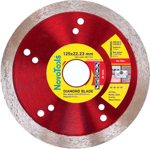 Диск алмазний NovoTools Profi 125 x 22,23 мм, Плитка— професійний алмазні відрізні диски 125 мм × 10 мм × посадка 22.23 мм. Призначений для різання таких матеріалів, як граніт, мармур, кераміка / плитка, скло. Широко застосовується в галузях: будівництво, ремонт та оздоблення, каменеобробка. Серія Extreme— максимальний ресурс та швидкість роботи для промислових умов. Виготовлений на основі абразиву Алмаз (специфікація HOT PRESSED), що забезпечує стабільну якість обробки та тривалий ресурс. Допустима швидкість до 12200 об/хв — безпечна робота на стандартних кутових шліфмашинах. Відповідає стандарту безпеки EN13236.