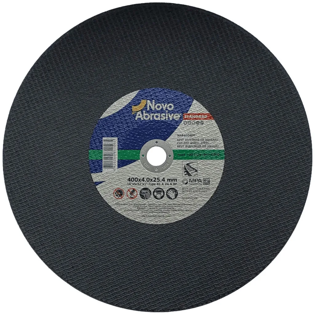 Cutting disc NovoAbrasive Standard 41 400 x 4.0 x 25.4 mm, rail, 100 m/s— professional Cutting discs 400 mm × 4 mm × 25.4 mm landing. Designed for cutting materials such as steel. Widely used in the following industries: railway construction, metalworking. The Standard series is a reliable solution for household and infrequent work. Affordable price while maintaining safety and quality. Made on the basis of aluminum oxide abrasive (specification A30 NBF), which provides stable processing quality and long service life. Permissible speed up to 3800 rpm — safe work on standard angle grinders. Certified by MPA Hannover (Germany) — independent confirmation of safety and quality according to the EN 12413 standard.
