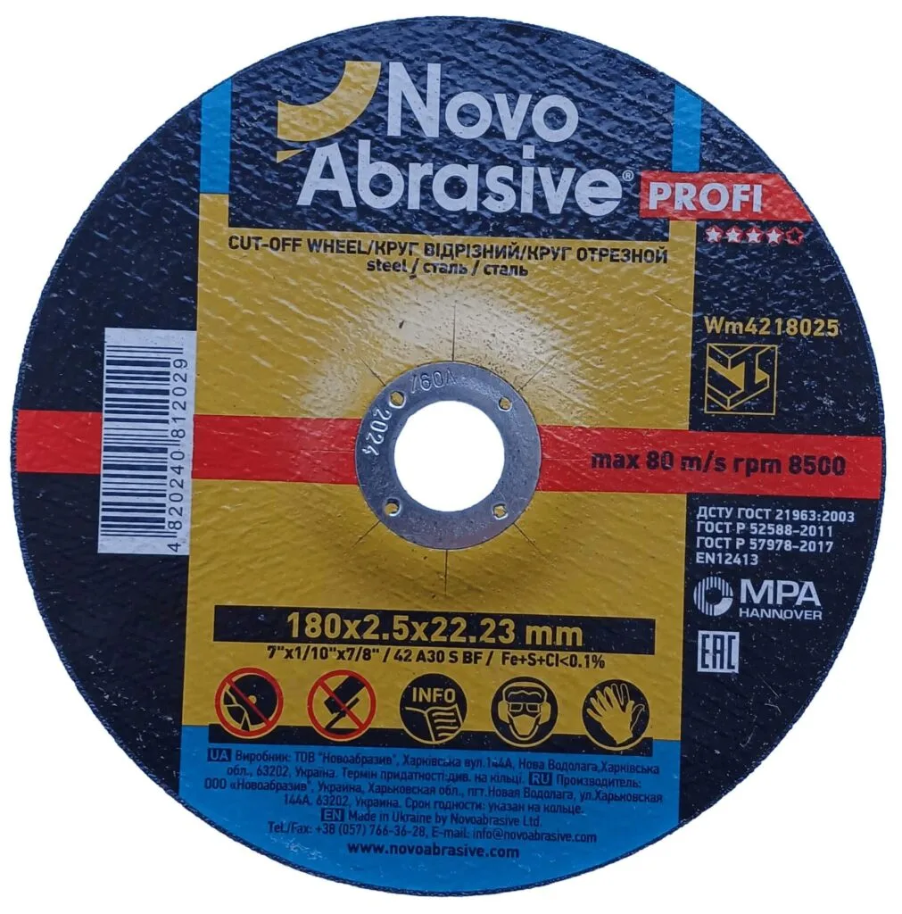 Cutting disc NOVOABRASIVE 42 180 x 2.5 x 22.23 mm, for metal— professional Cutting discs 180 mm × 2.5 mm × 22.23 mm fit. Designed for cutting materials such as steel, stainless steel, cast iron, non-ferrous metals. Widely used in the following industries: metalworking, construction, automotive industry, pipe production. Profi series — optimal price/quality ratio for daily professional work. Stable cutting quality and durability. Made on the basis of aluminum oxide abrasive (specification A30 SBF), which ensures stable processing quality and long service life. Permissible speed up to 8600 rpm — safe work on standard angle grinders. Certified by MPA Hannover (Germany) — independent confirmation of safety and quality according to EN 12413.