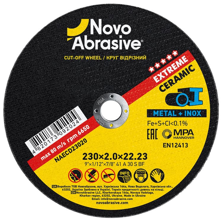 NovoAbrasive Extreme 41 230 x 2.0 x 22.23 mm cutting wheel, metal, complies with the safety standard EN12413. This standard regulates the requirements for the strength, marking and safe use of abrasive tools.