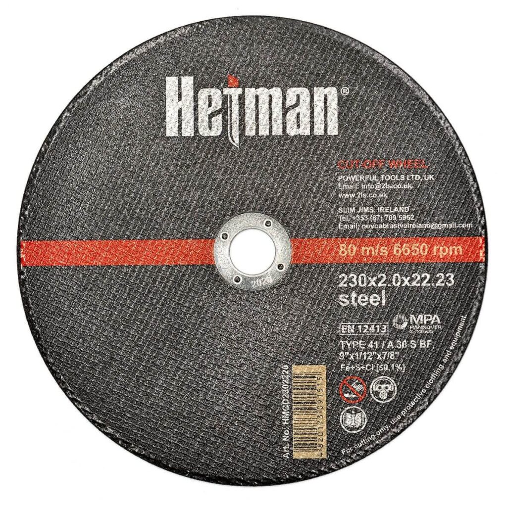 Hetman 41 cutting wheel 230 x 2.0 x 22.23 mm, for metal, suitable for processing: Steel, Cast iron, Aluminum, Non-ferrous metals. Choose the appropriate operating mode depending on the hardness of the material.