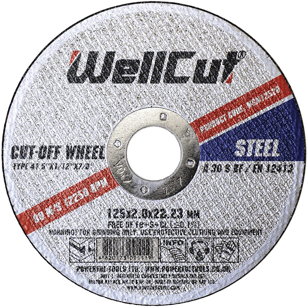 The WellCut cutting wheel 125 x 2.0 x 22.23 mm, for metal, complies with the safety standard EN12413. This standard regulates the requirements for the strength, marking and safe use of abrasive tools.