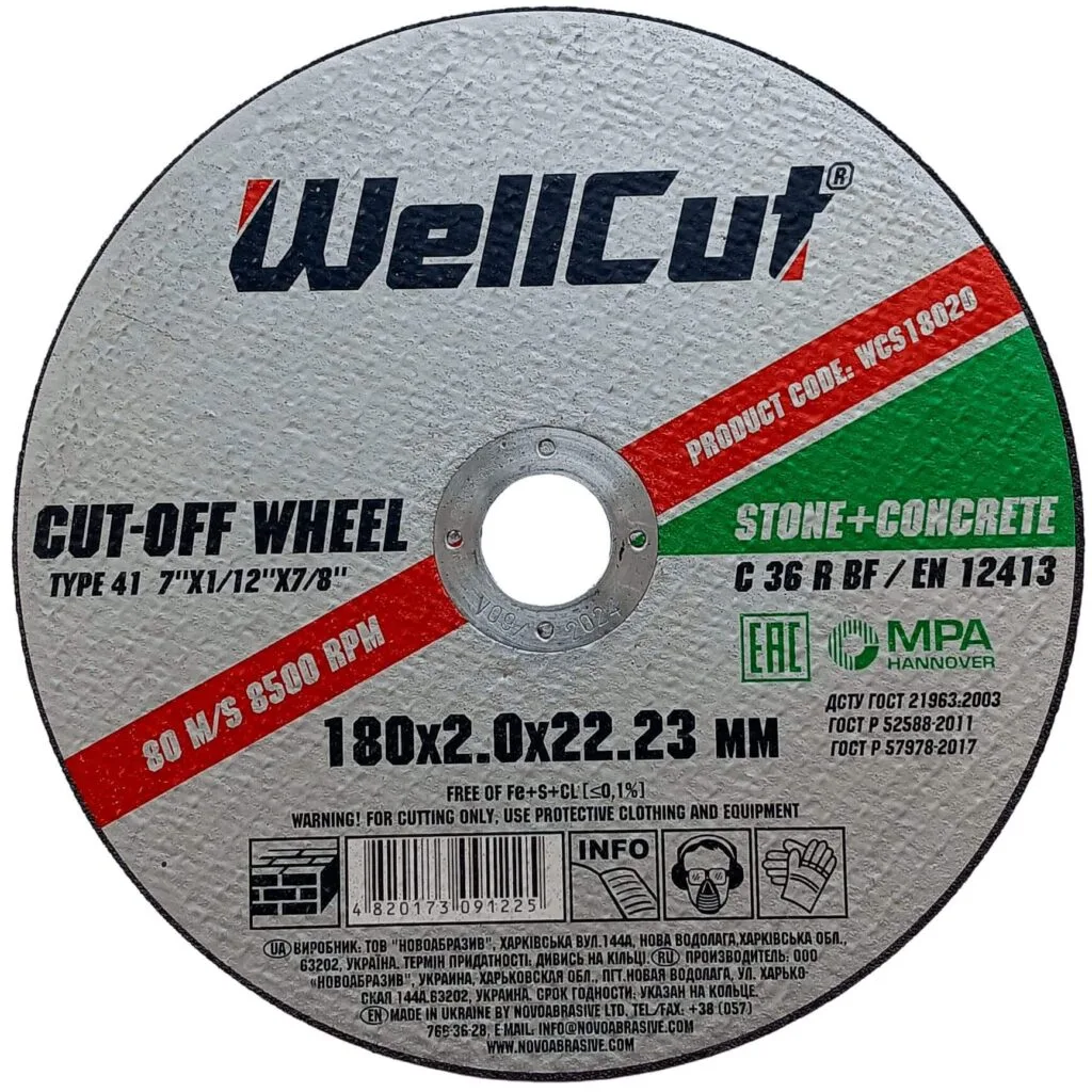 WellCut Cutting disc 180 x 2.0 x 22.23 mm, for stone - professional Cutting discs 180 mm × 2 mm × 22.23 mm fit. Designed for cutting materials such as concrete, stone, brick. Widely used in the following industries: construction, repair and decoration. Profi series - optimal price/quality ratio for daily professional work. Stable cutting quality and durability. Made on the basis of silicon carbide abrasive (specification C36 RBF), which ensures stable processing quality and long service life. Permissible speed up to 8600 rpm - safe work on standard angle grinders. Certified by MPA Hannover (Germany) - independent confirmation of safety and quality according to EN 12413.