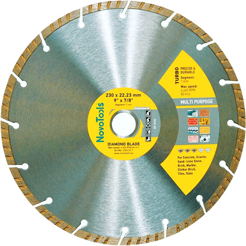 The NovoTools Standard 230 x 22.23 mm Turbo diamond disc complies with the safety standard EN13236. This standard regulates the requirements for the strength, marking and safe use of abrasive tools.