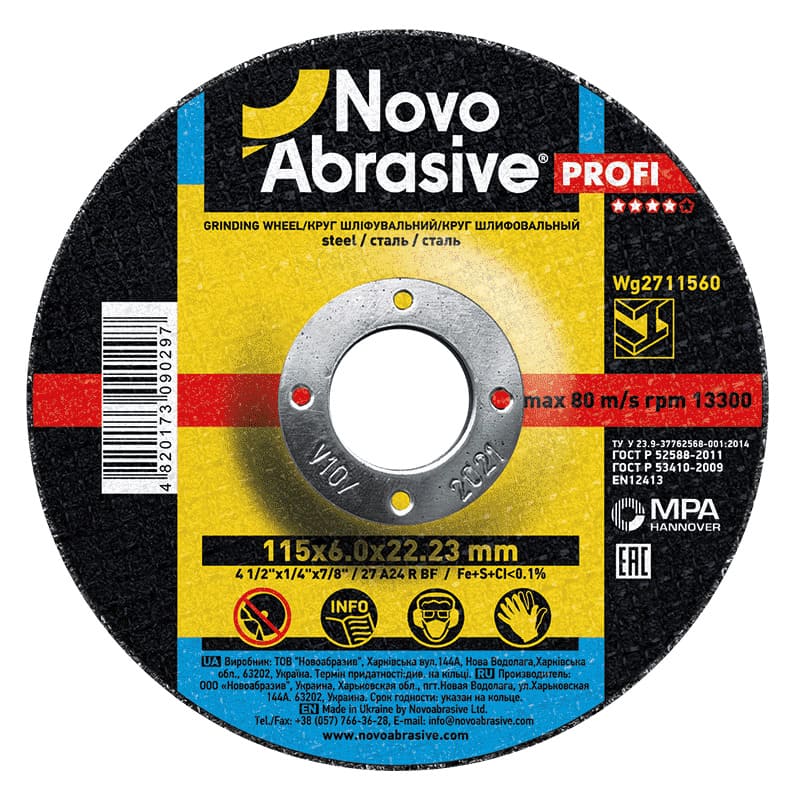 Grinding disc NOVOABRASIVE 27 115x6.0x22.23 mm, for metal— professional grinding discs 115 mm × 6 mm × fit 22.23 mm. Profi series — optimal price/quality ratio for daily grinding. Stable performance and uniform wear. Made on the basis of aluminum oxide abrasive (specification A24 RBF), which ensures stable processing quality and long service life. Permissible speed up to 13300 rpm — safe operation on standard angle grinders. Certified by MPA Hannover (Germany) — independent confirmation of safety and quality according to EN 12413.
