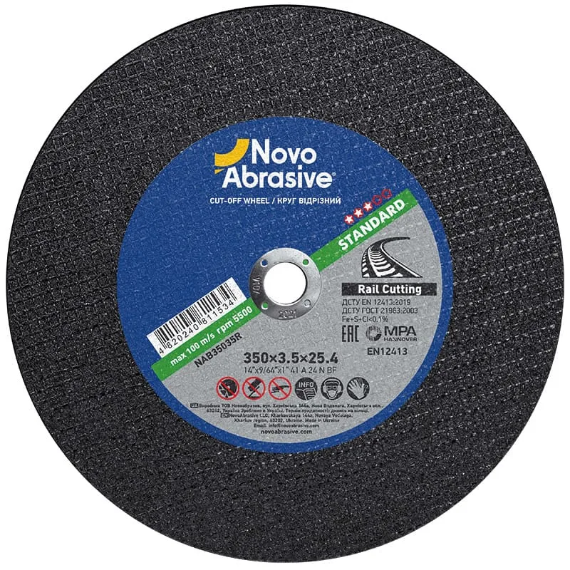 El disco de corte NovoAbrasive Standard 41 de 350 x 3,5 x 25,4 mm con raíl y velocidad de 100 m/s cumple con la norma de seguridad EN 12413. Esta norma regula los requisitos de resistencia, marcado y uso seguro de las herramientas abrasivas.