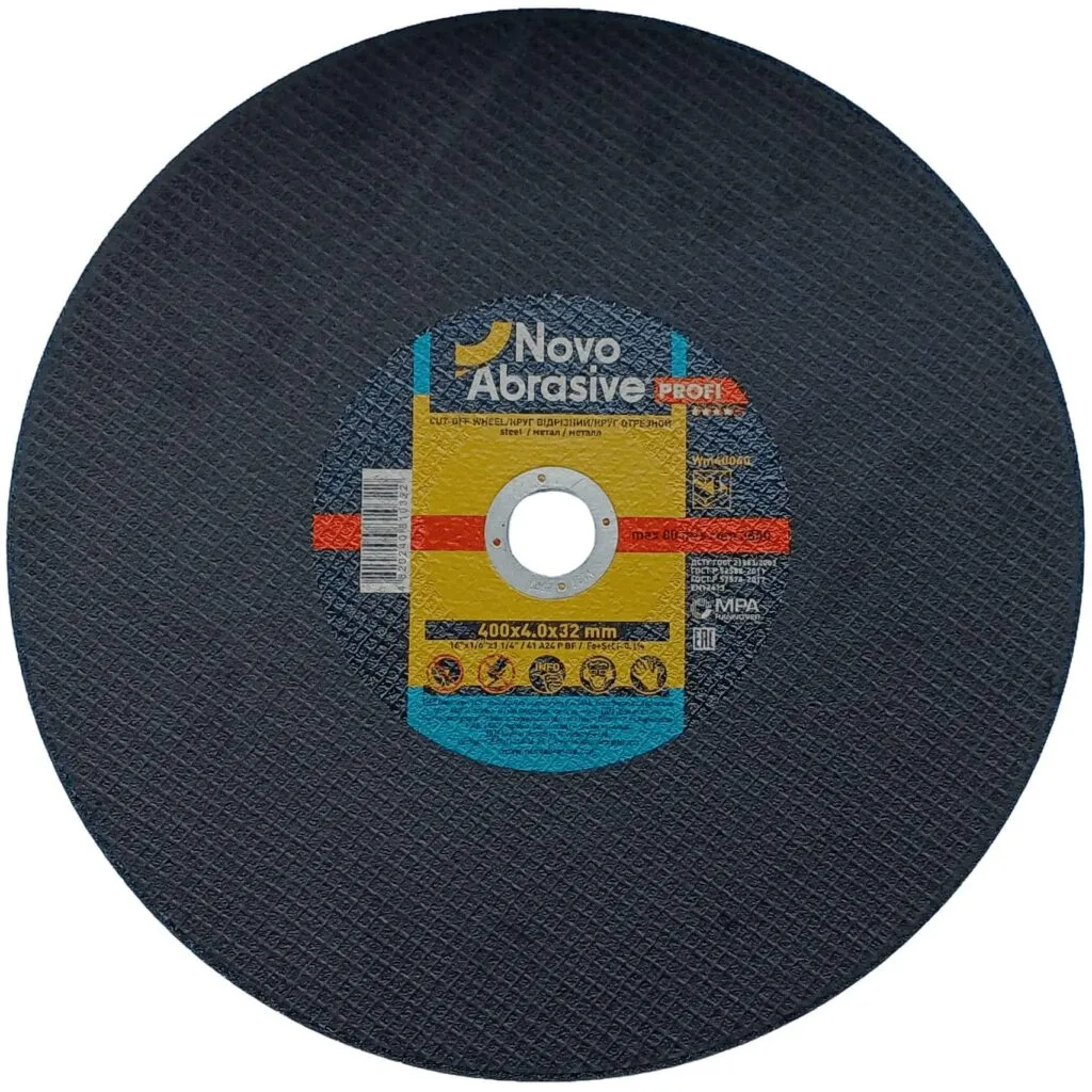 Disco de corte NOVOABRASIVE 41 400 x 4,0 x 32 mm para metal: discos de corte profesionales de 400 mm × 4 mm × 32 mm. Diseñados para cortar materiales como acero, fundición, aluminio y metales no ferrosos. Ampliamente utilizados en las siguientes industrias: metalurgia, construcción, automoción y producción de tuberías. Serie Profi: óptima relación calidad-precio para el trabajo profesional diario. Calidad de corte estable y durabilidad. Fabricados con abrasivo de óxido de aluminio (especificación A30 SBF), que garantiza una calidad de procesamiento estable y una larga vida útil. Velocidad admisible de hasta 4400 rpm: trabajo seguro en amoladoras angulares estándar. Certificado por MPA Hannover (Alemania): certificación independiente de seguridad y calidad según la norma EN 12413.