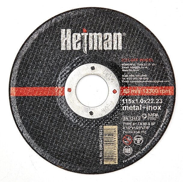 Круг відрізний Hetman 41 115x1,0x22,23 мм, по металу відповідає стандарту безпеки EN12413. Цей стандарт регулює вимоги до міцності, маркування та безпечного використання абразивних інструментів.