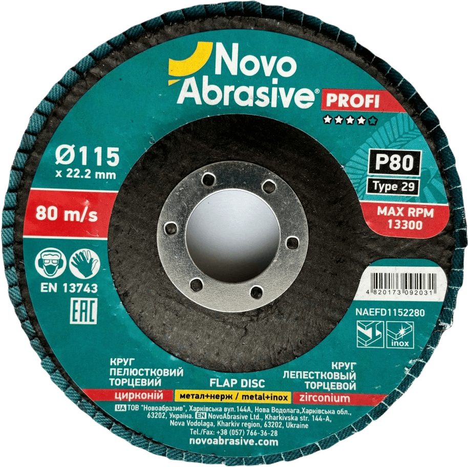 NovoAbrasive Profi 29 115 x 22,23 mm, P80, Zirconio - Discos abrasivos profesionales de 115 mm × 22,23 mm. Serie Profi: abrasivo de zirconio y aluminio para el trabajo profesional diario. Rendimiento estable y durabilidad. El grano abrasivo de corindón de zirconio proporciona un alto rendimiento y un desgaste uniforme. Velocidad admisible de hasta 13300 rpm: trabajo seguro en amoladoras angulares estándar. Cumple con la norma de seguridad EN13743.