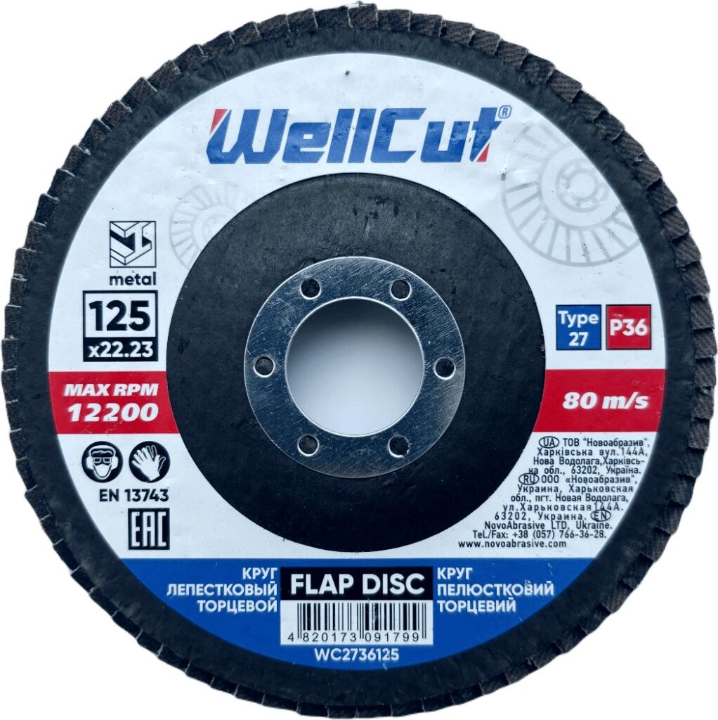 Круг пелюстковий торцевий WellCut 27 125x22,23 мм, P36 відповідає стандарту безпеки EN13743. Цей стандарт регулює вимоги до міцності, маркування та безпечного використання абразивних інструментів.