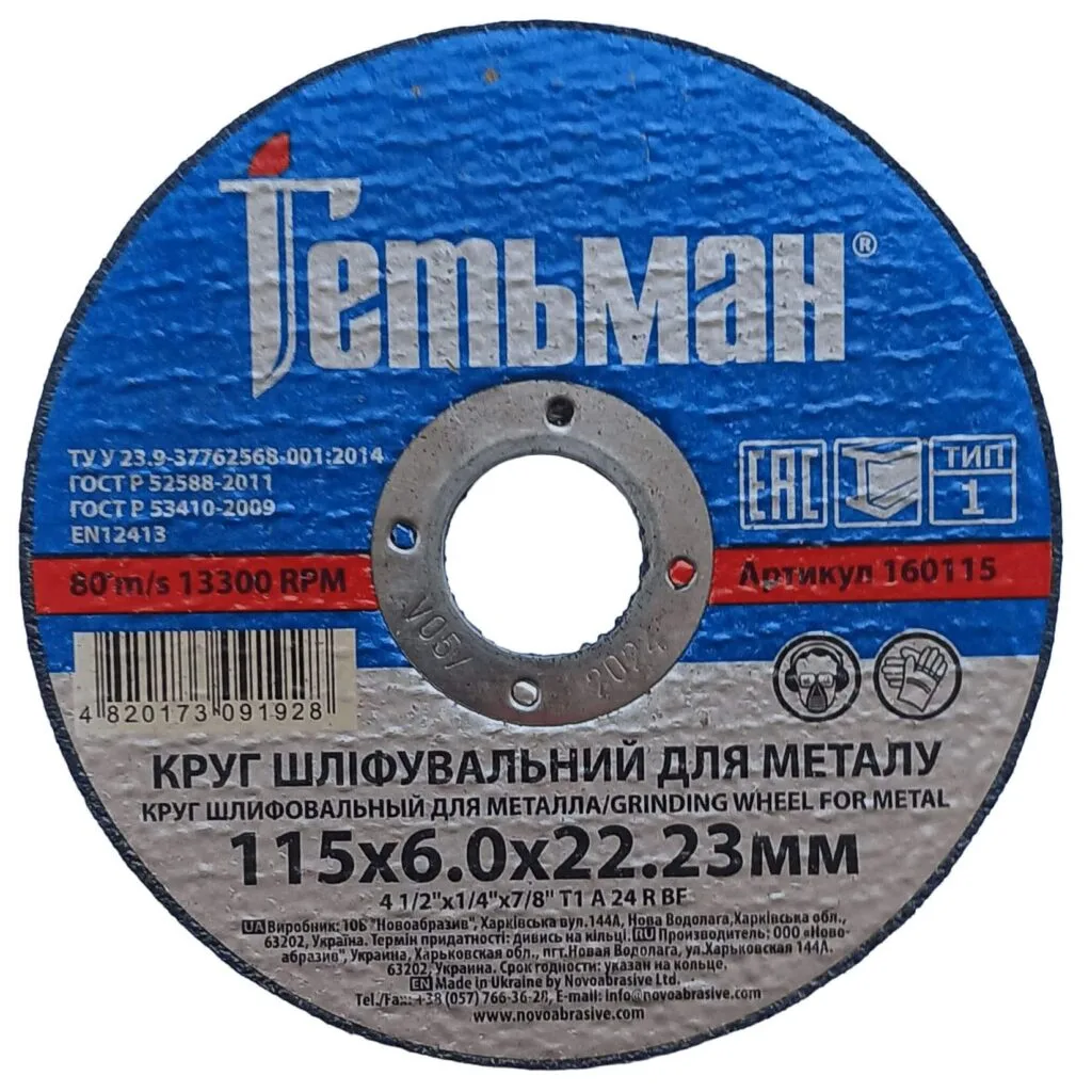Muela abrasiva Getman 1 115x6,0x22,23 mm para metal - Muelas abrasivas profesionales de 115 mm × 6 mm × rellano de 22,23 mm. Diseñadas para desbaste, desbaste, desbarbado y procesamiento de soldaduras en materiales como acero inoxidable, acero, fundición y aluminio. Ampliamente utilizadas en las siguientes industrias: metalurgia, construcción, automoción y producción de tuberías. Serie estándar: una solución fiable para trabajos de desbaste domésticos y ocasionales. Precio asequible, manteniendo la seguridad y la calidad. El grano abrasivo de óxido de aluminio proporciona un alto rendimiento y un desgaste uniforme. Velocidad admisible de hasta 13300 rpm: trabajo seguro en amoladoras angulares estándar. Certificado por MPA Hannover (Alemania): confirmación independiente de seguridad y calidad según la norma EN 12413.