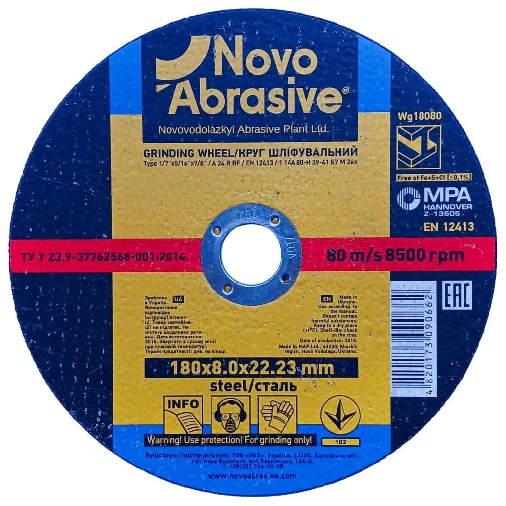 Disco abrasiva NOVOABRASIVE 1 180x8,0x22,23 mm para metal, apta para procesar: acero inoxidable, acero, fundición, aluminio y metales no ferrosos. Seleccione el modo de funcionamiento adecuado según la dureza del material.