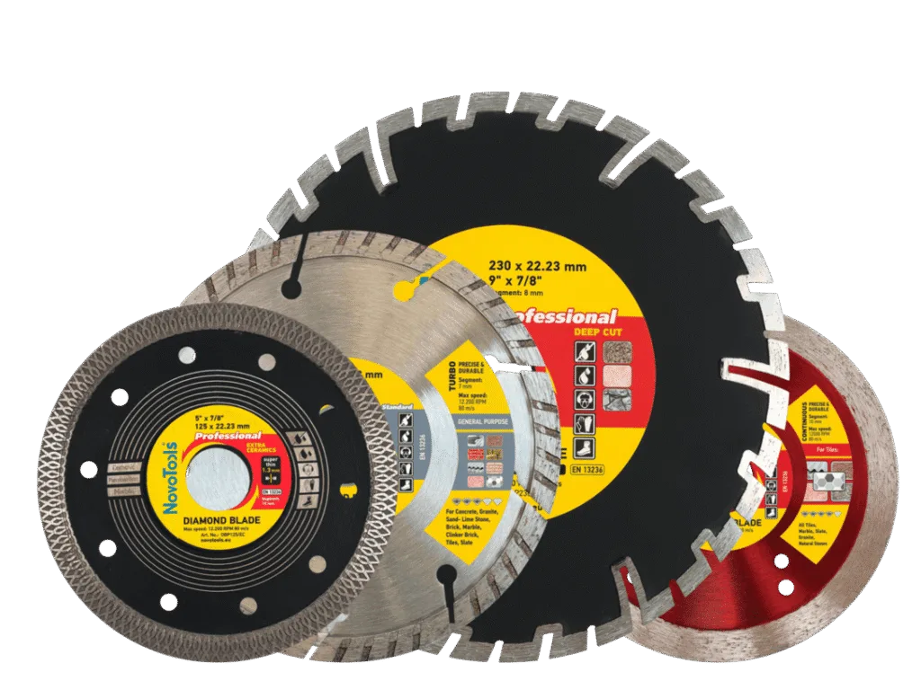Les disques de coupe diamantés NovoAbrasive sont conçus pour la découpe du béton, du granit, du marbre, de la céramique, de la brique et de l'asphalte. Ils utilisent des diamants synthétiques de qualité industrielle, fixés sur un corps en acier par soudage laser ou frittage.