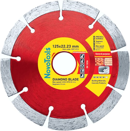 Диск алмазний NovoTools Profi 125x10x22,23 мм, Сегмент підходить для обробки: Бетон, Цегла, Камінь, Кераміка / Плитка. Обирайте відповідний режим роботи залежно від твердості матеріалу.