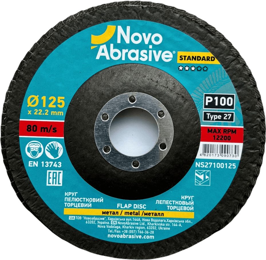 Il disco lamellare NOVOABRASIVE 27 125x22,23 mm, P100 è conforme alla norma di sicurezza EN13743. Questa norma regola i requisiti di resistenza, marcatura e utilizzo sicuro degli utensili abrasivi.