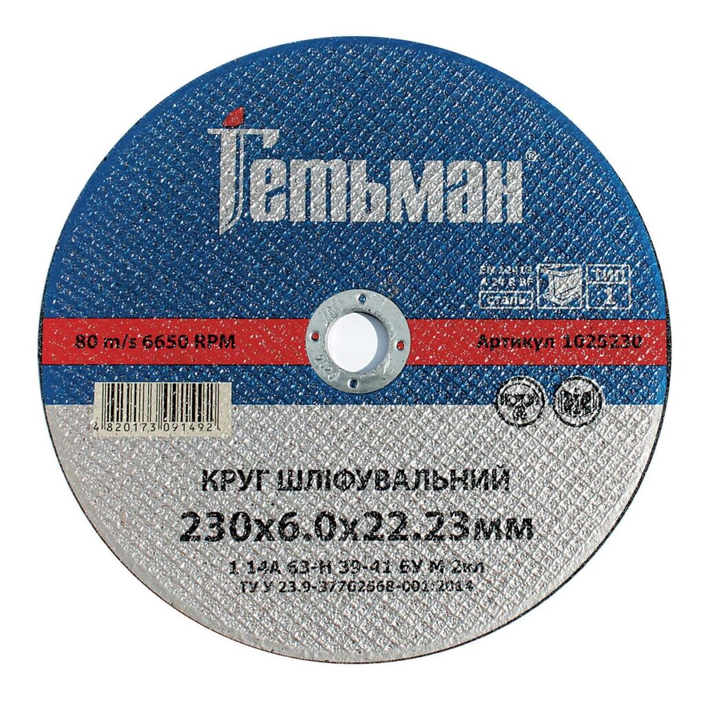 Круг шліфувальный Гетьман 1 230х6,0х22,23 мм, по металу відповідає стандарту безпеки EN12413. Цей стандарт регулює вимоги до міцності, маркування та безпечного використання абразивних інструментів.
