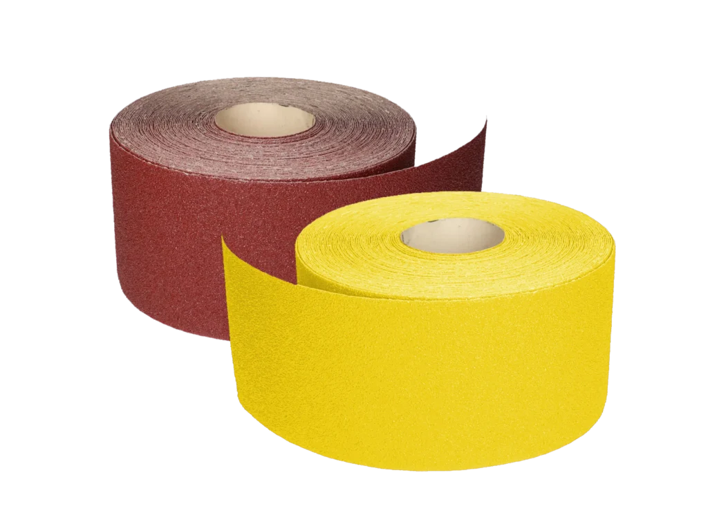 Base: tessuto o carta. Larghezza 50–150 mm, lunghezza rotolo 25–50 m. Grana P40–P320. Formato economico con spreco minimo.
