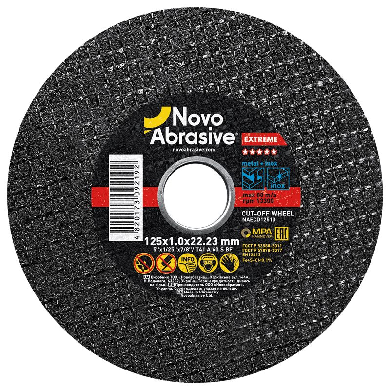 Круг відрізний NovoAbrasive Extreme 41 125х1,0х22,23 мм, по металу відповідає стандарту безпеки EN12413. Цей стандарт регулює вимоги до міцності, маркування та безпечного використання абразивних інструментів.