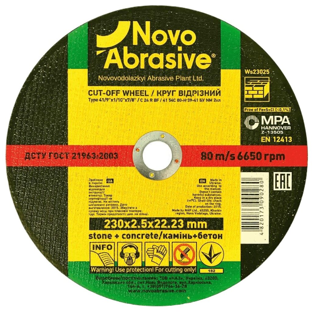 Круг відрізний NOVOABRASIVE 41 54С 230х2,5х22,23 мм, для каменю відповідає стандарту безпеки EN12413. Цей стандарт регулює вимоги до міцності, маркування та безпечного використання абразивних інструментів.
