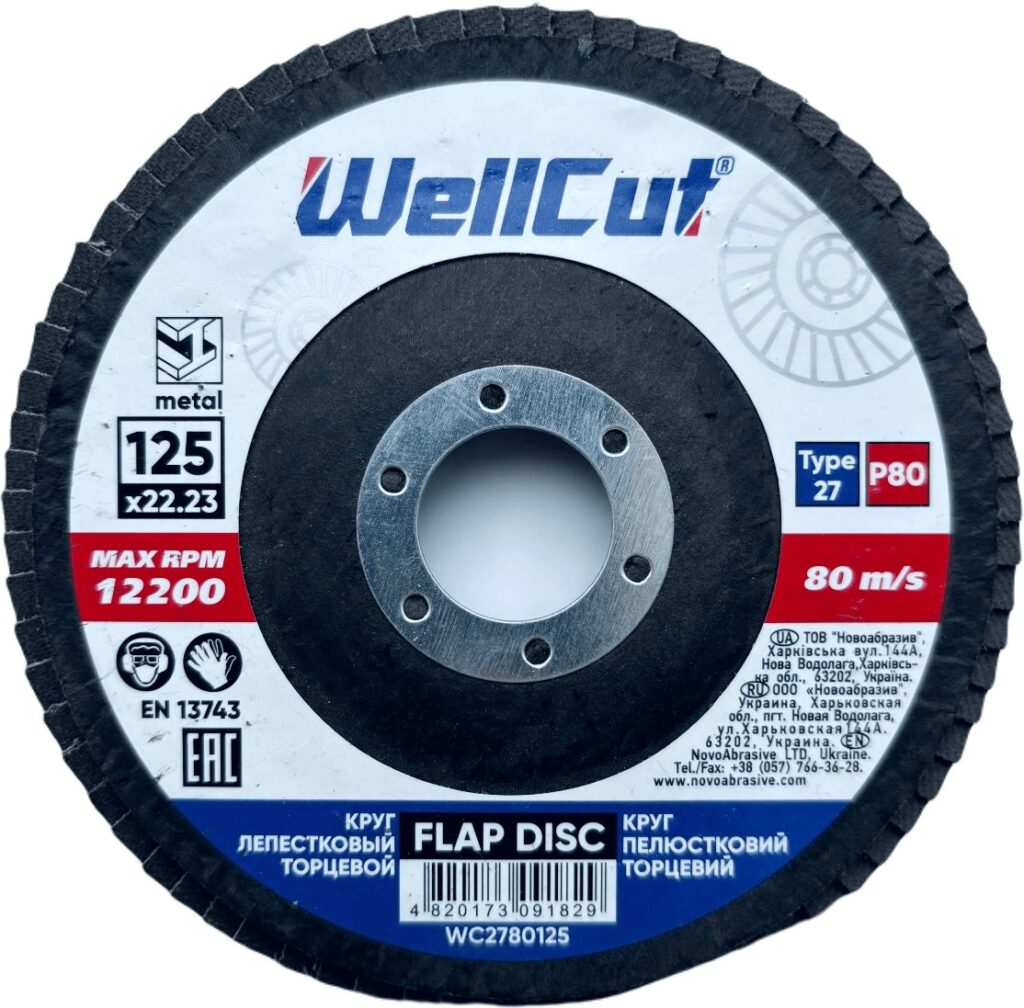 Круг пелюстковий торцевий WellCut 27 125x22,23 мм, P80 відповідає стандарту безпеки EN13743. Цей стандарт регулює вимоги до міцності, маркування та безпечного використання абразивних інструментів.