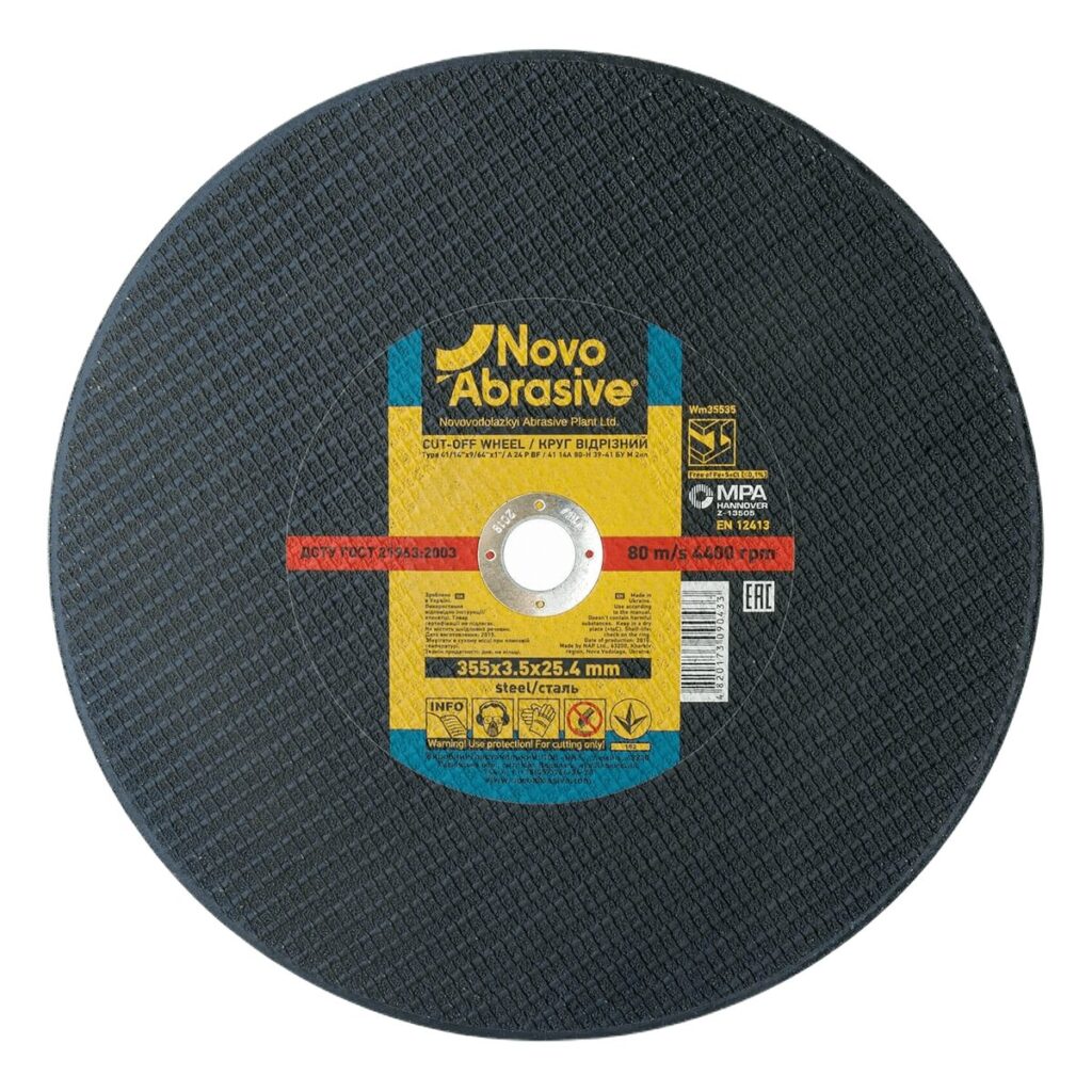 Круг відрізний NOVOABRASIVE 41 355 х 3,5 х 25,4 мм, по металу відповідає стандарту безпеки EN12413. Цей стандарт регулює вимоги до міцності, маркування та безпечного використання абразивних інструментів.