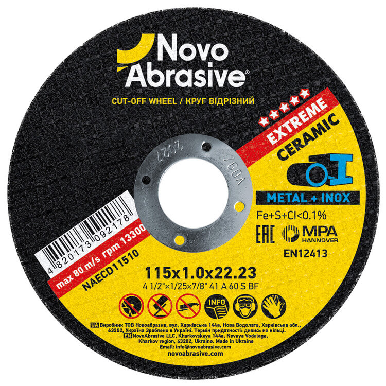 Круг відрізний NovoAbrasive Extreme 41 115 х 1,0 х 22,23 мм, по металу — професійний відрізні круги 115 мм × 1 мм × посадка 22.23 мм. Серія Extreme — максимальна продуктивність для важких промислових умов. Подовжений ресурс та стабільне різання при інтенсивному навантаженні. Виготовлений на основі абразиву Керамічний оксид алюмінію (специфікація A60 SBF), що забезпечує стабільну якість обробки та тривалий ресурс. Допустима швидкість до 13300 об/хв — безпечна робота на стандартних кутових шліфмашинах. Сертифіковано MPA Hannover (Німеччина) — незалежне підтвердження безпеки та якості за стандартом EN 12413.