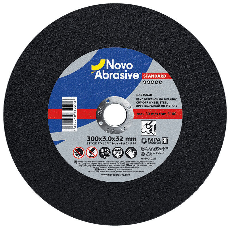 Круг відрізний NovoAbrasive Standard 41 300 х 3,0 х 32 мм, по металу відповідає стандарту безпеки EN12413. Цей стандарт регулює вимоги до міцності, маркування та безпечного використання абразивних інструментів.