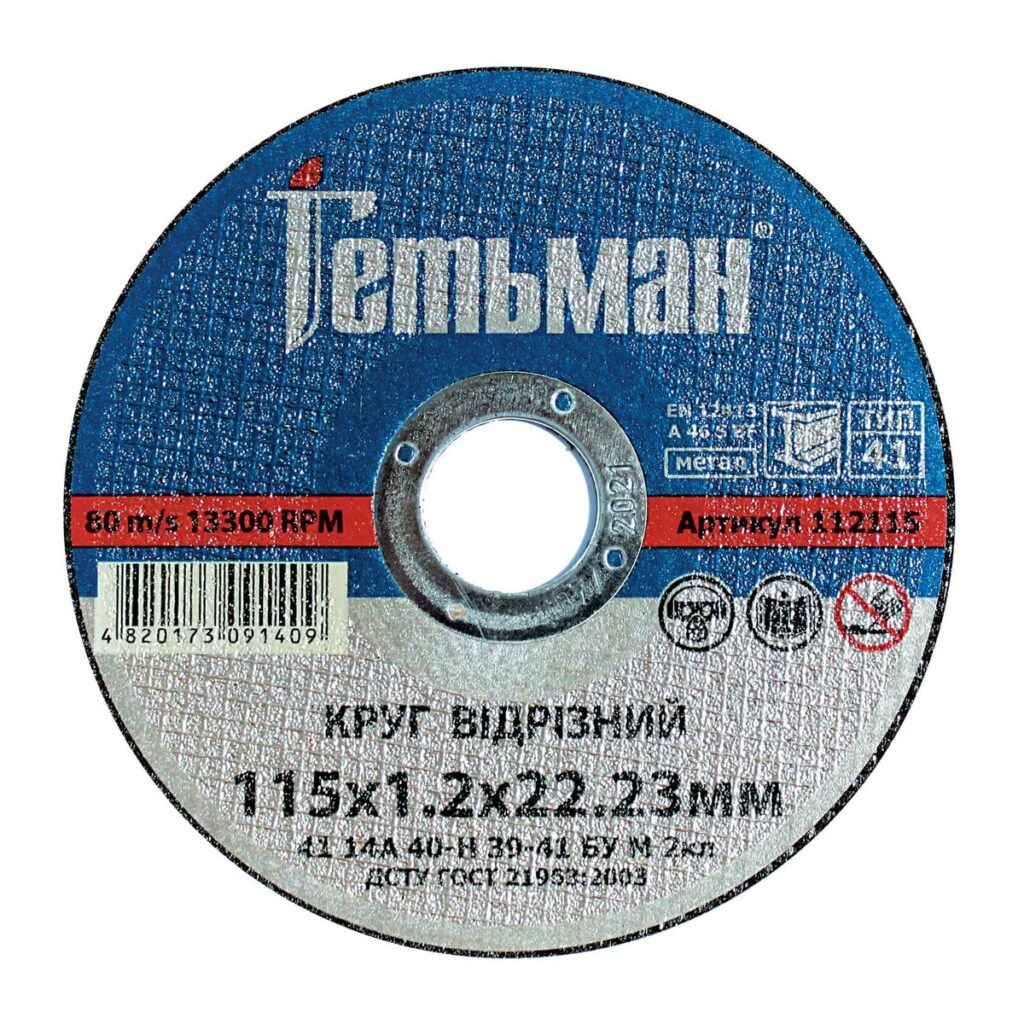 Круг відрізний Гетьман 41 115х1,2х22,23 мм, по металу відповідає стандарту безпеки EN12413. Цей стандарт регулює вимоги до міцності, маркування та безпечного використання абразивних інструментів.