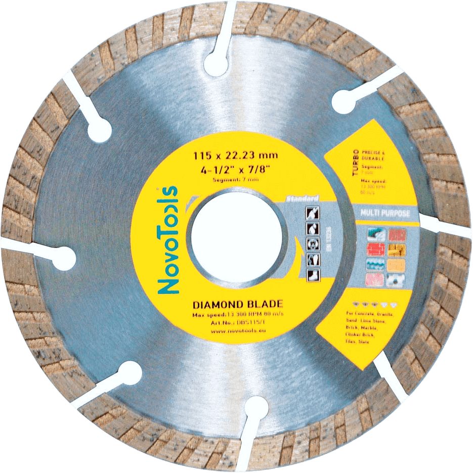 Диск алмазний NovoTools Standard 115 x 22,23 мм, Турбо підходить для обробки: Бетон, Залізобетон, Цегла, Камінь, Граніт. Обирайте відповідний режим роботи залежно від твердості матеріалу.