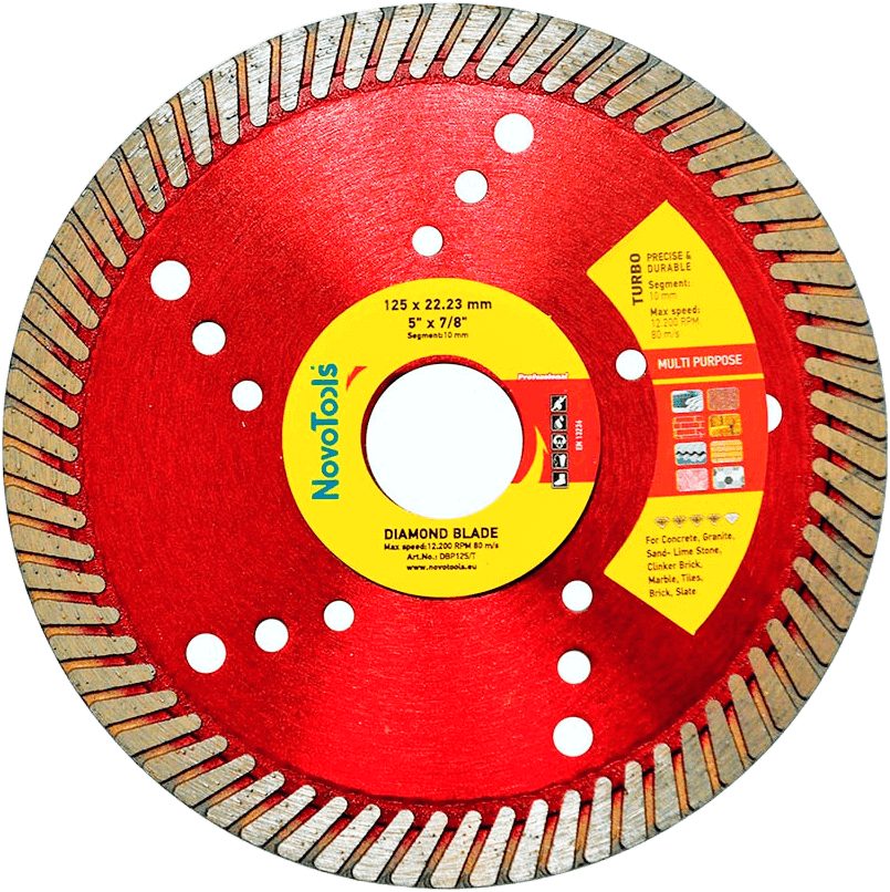 Диск алмазний NovoTools Profi 125 x 22,23 мм, Турбо підходить для обробки: Бетон, Залізобетон, Цегла, Камінь, Граніт. Обирайте відповідний режим роботи залежно від твердості матеріалу.