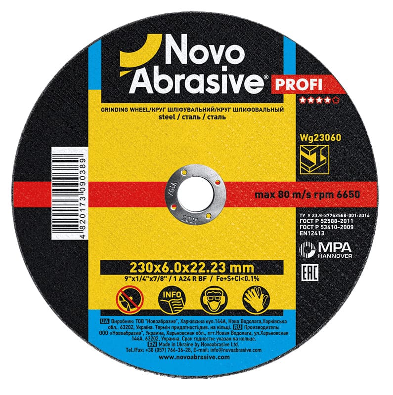 Круг шліфувальний NOVOABRASIVE 1 230х6,0х22,23 мм, по металу відповідає стандарту безпеки EN12413. Цей стандарт регулює вимоги до міцності, маркування та безпечного використання абразивних інструментів.