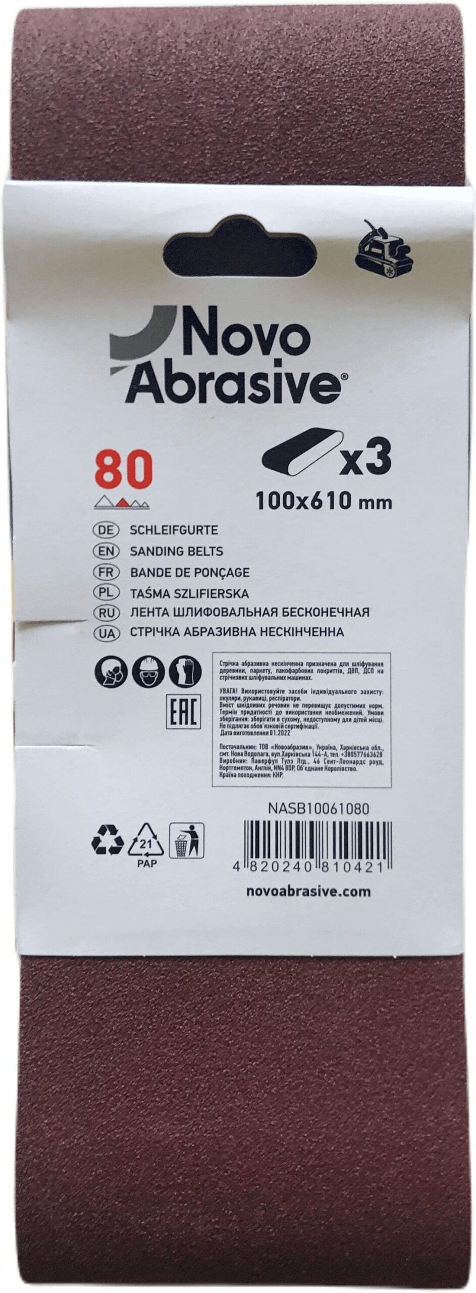 Стрічка шліфувальна NovoAbrasive 100×610 мм, Р80, 3 шт.